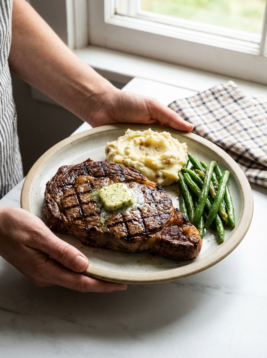 a close-up, ultra-realistic photograph perfect for a cookbook captures a perfectly grilled steak with crosshatch grill marks, served with roasted garlic mashed potatoes and sautéed green beans, topped with herb butter.