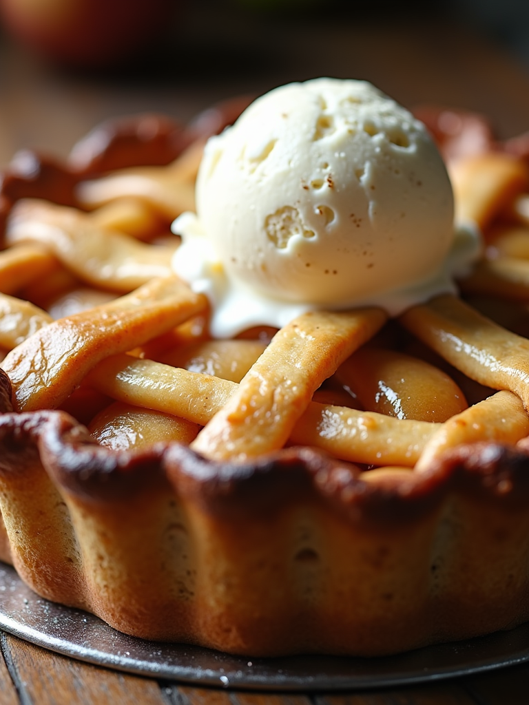 a close-up, ultra-realistic photograph perfect for a cookbook captures a rustic apple pie with a golden lattice crust, visible cinnamon-spiced apple filling, and a scoop of melting vanilla ice cream on top.
