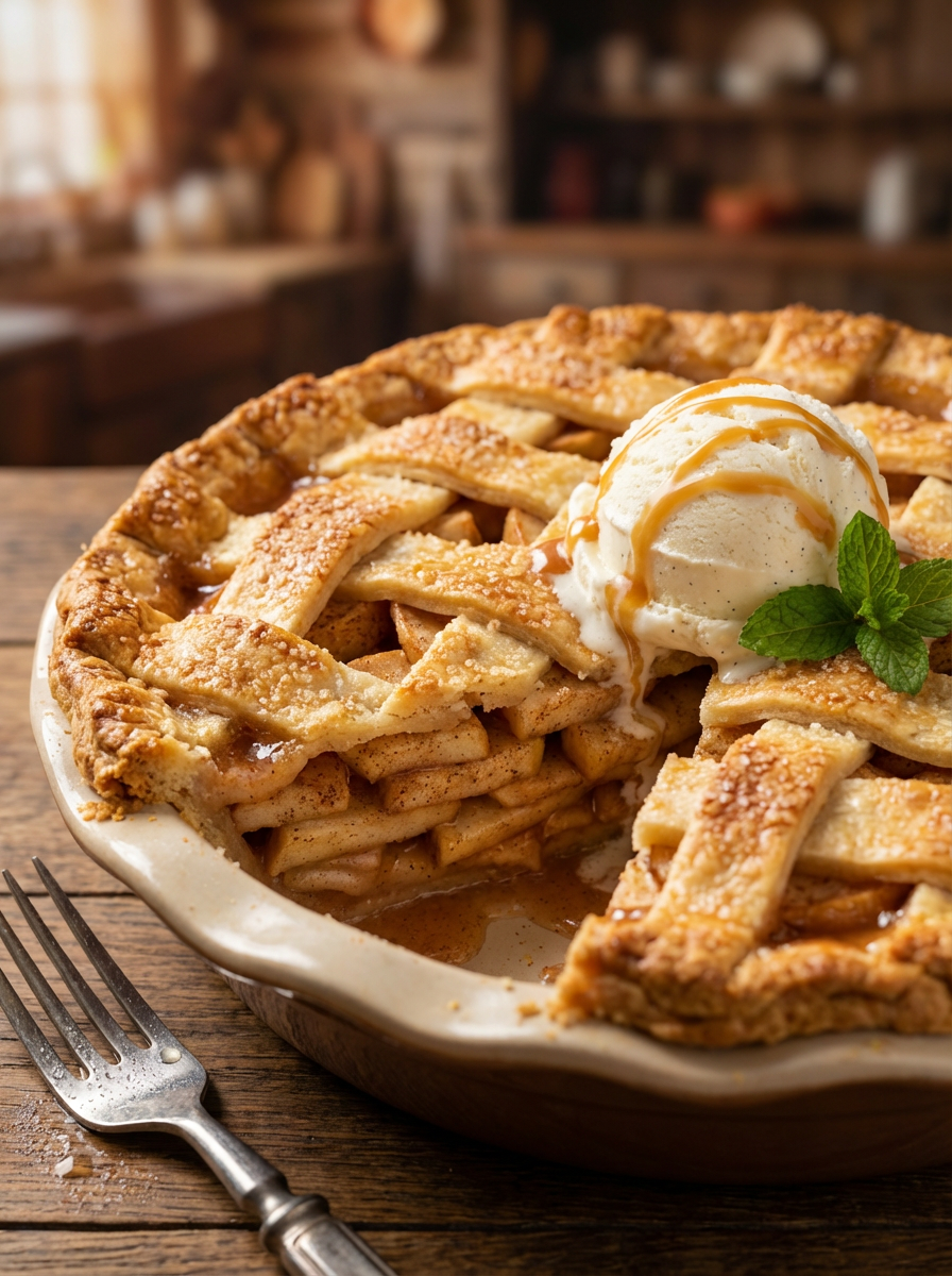 a close-up, ultra-realistic photograph perfect for a cookbook captures a rustic apple pie with a golden lattice crust, visible cinnamon-spiced apple filling, and a scoop of melting vanilla ice cream on top.