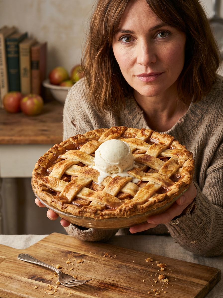 a close-up, ultra-realistic photograph perfect for a cookbook captures a rustic apple pie with a golden lattice crust, visible cinnamon-spiced apple filling, and a scoop of melting vanilla ice cream on top.