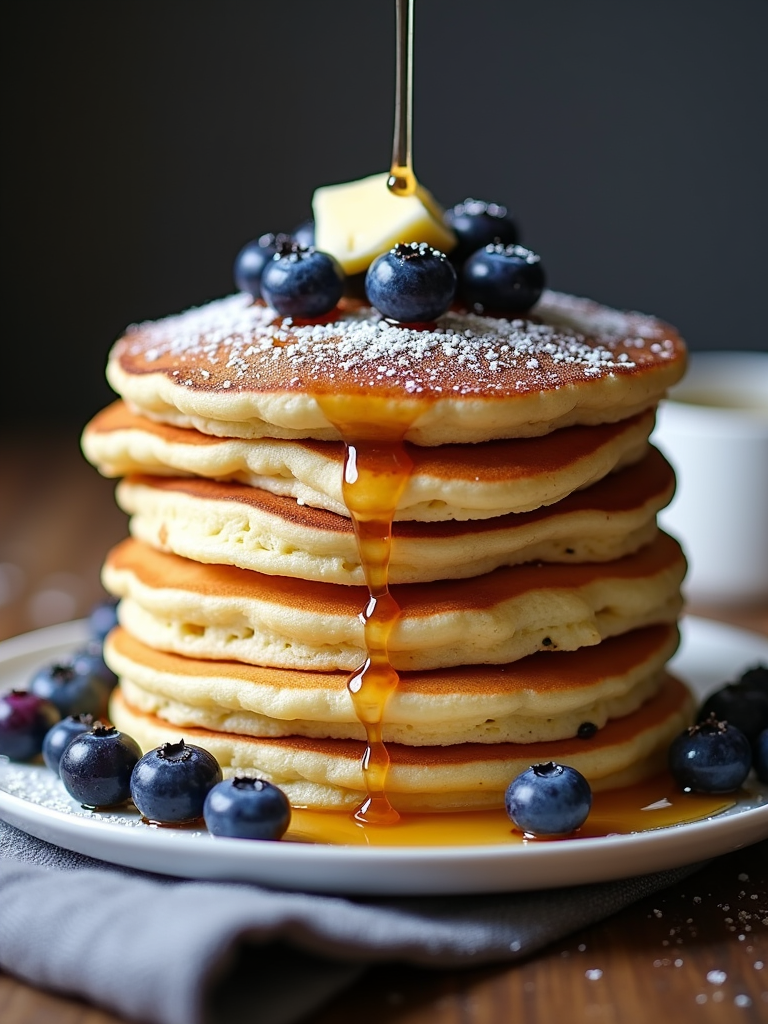 a close-up, ultra-realistic photograph perfect for a cookbook captures a stack of fluffy blueberry pancakes with maple syrup dripping down the sides, topped with fresh blueberries, a pat of butter, and a sprinkle of powdered sugar.