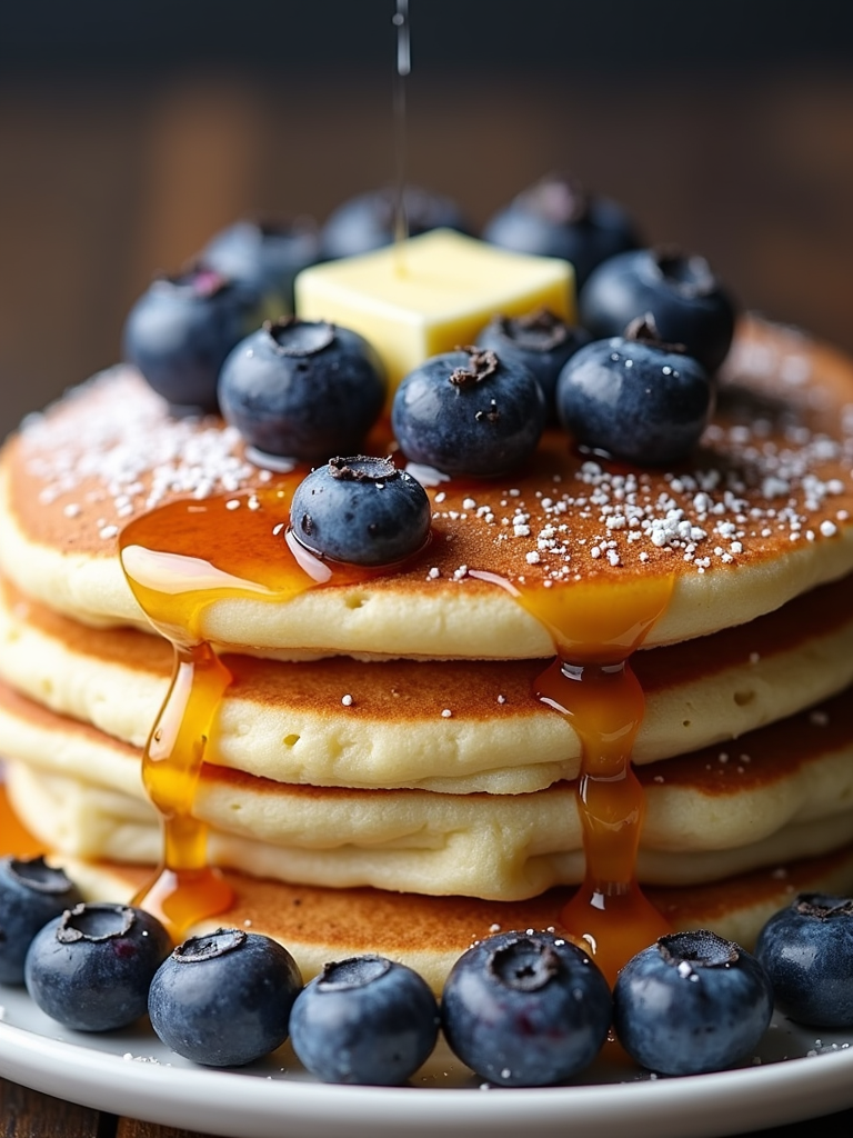 a close-up, ultra-realistic photograph perfect for a cookbook captures a stack of fluffy blueberry pancakes with maple syrup dripping down the sides, topped with fresh blueberries, a pat of butter, and a sprinkle of powdered sugar.