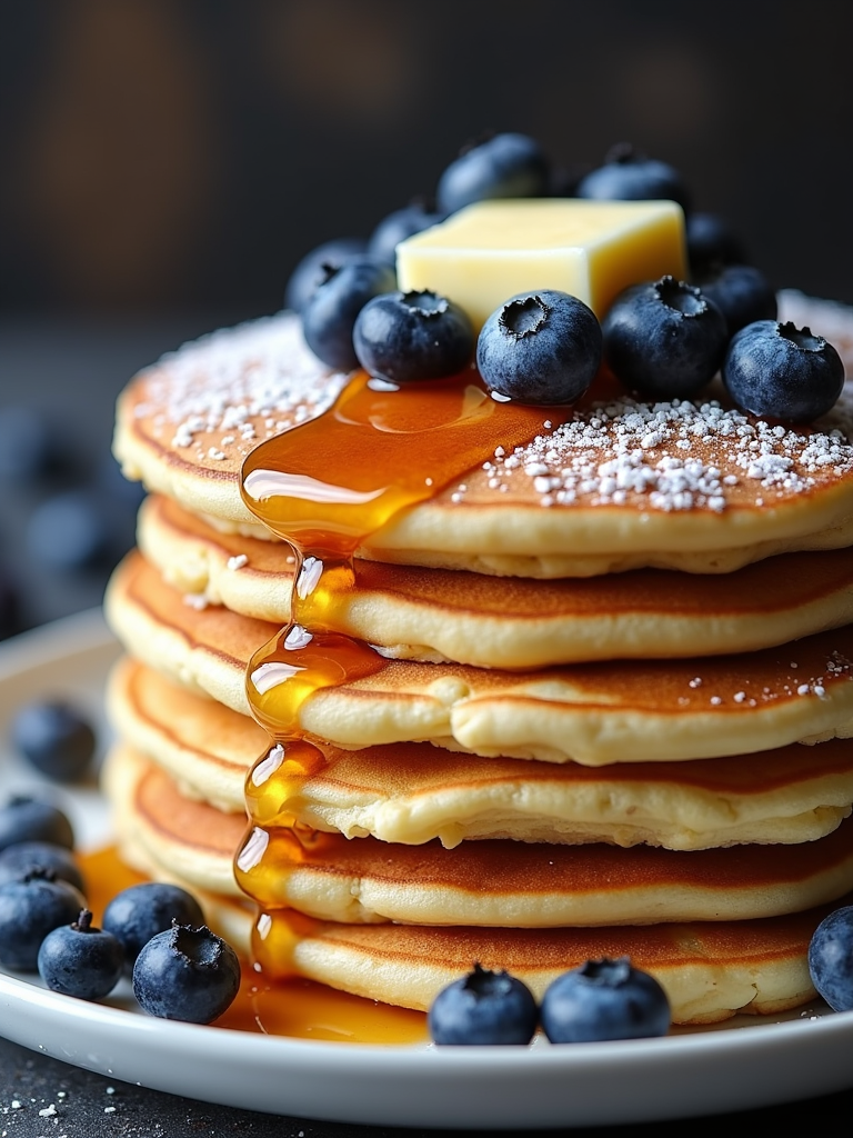a close-up, ultra-realistic photograph perfect for a cookbook captures a stack of fluffy blueberry pancakes with maple syrup dripping down the sides, topped with fresh blueberries, a pat of butter, and a sprinkle of powdered sugar.