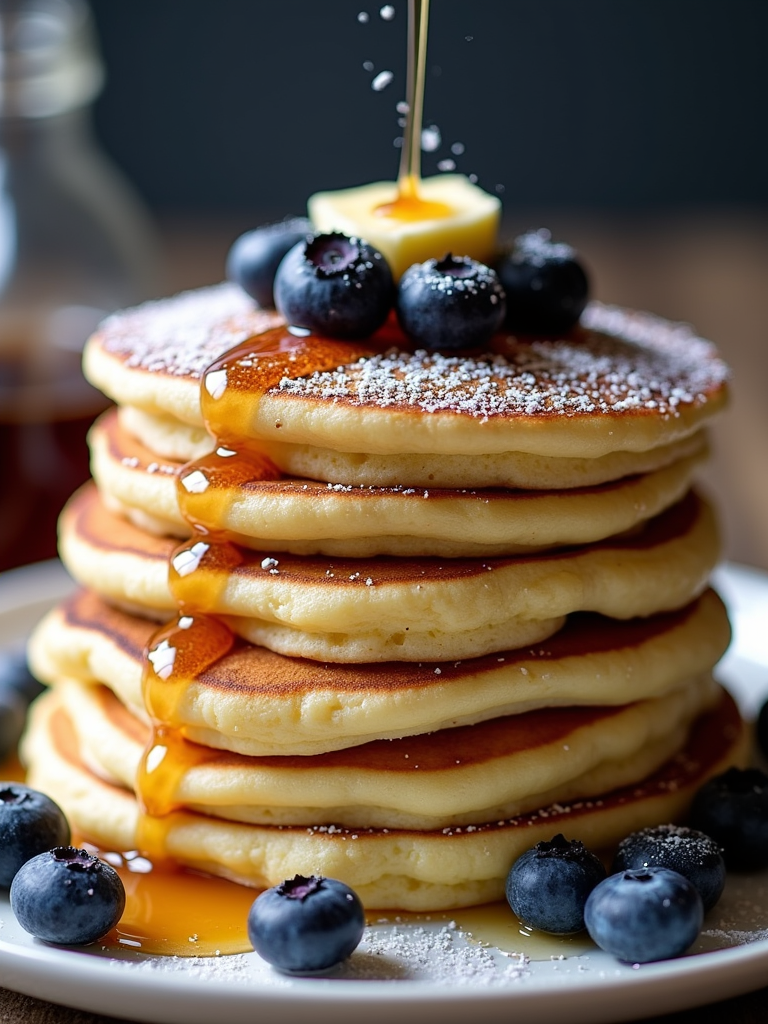 a close-up, ultra-realistic photograph perfect for a cookbook captures a stack of fluffy blueberry pancakes with maple syrup dripping down the sides, topped with fresh blueberries, a pat of butter, and a sprinkle of powdered sugar.