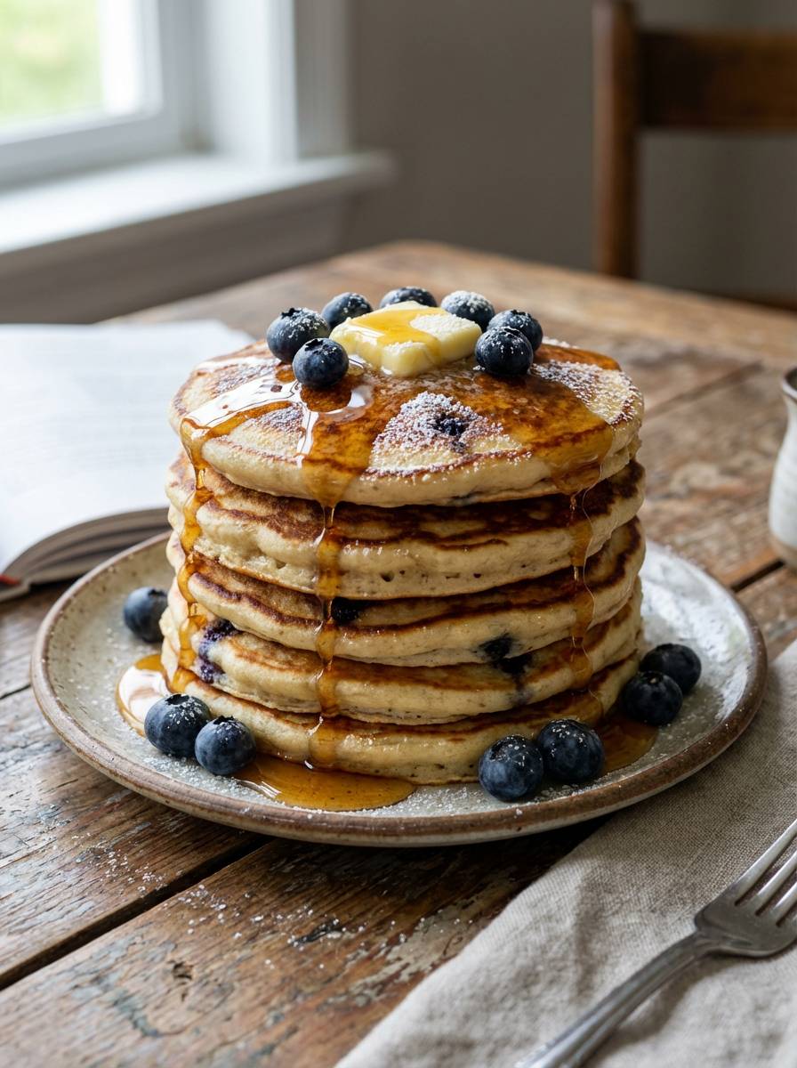 a close-up, ultra-realistic photograph perfect for a cookbook captures a stack of fluffy blueberry pancakes with maple syrup dripping down the sides, topped with fresh blueberries, a pat of butter, and a sprinkle of powdered sugar.