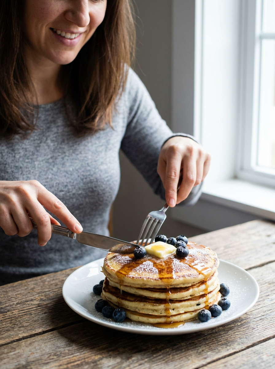 a close-up, ultra-realistic photograph perfect for a cookbook captures a stack of fluffy blueberry pancakes with maple syrup dripping down the sides, topped with fresh blueberries, a pat of butter, and a sprinkle of powdered sugar.