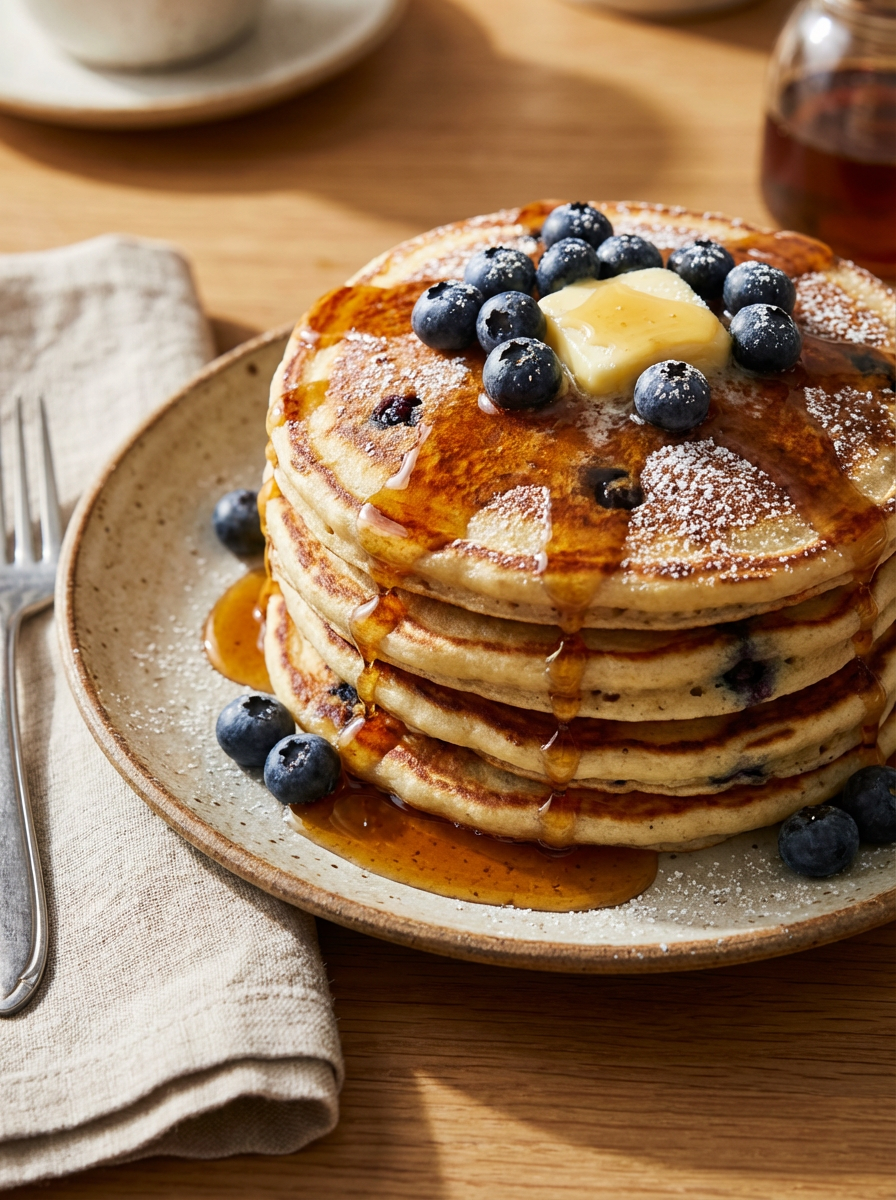 a close-up, ultra-realistic photograph perfect for a cookbook captures a stack of fluffy blueberry pancakes with maple syrup dripping down the sides, topped with fresh blueberries, a pat of butter, and a sprinkle of powdered sugar.