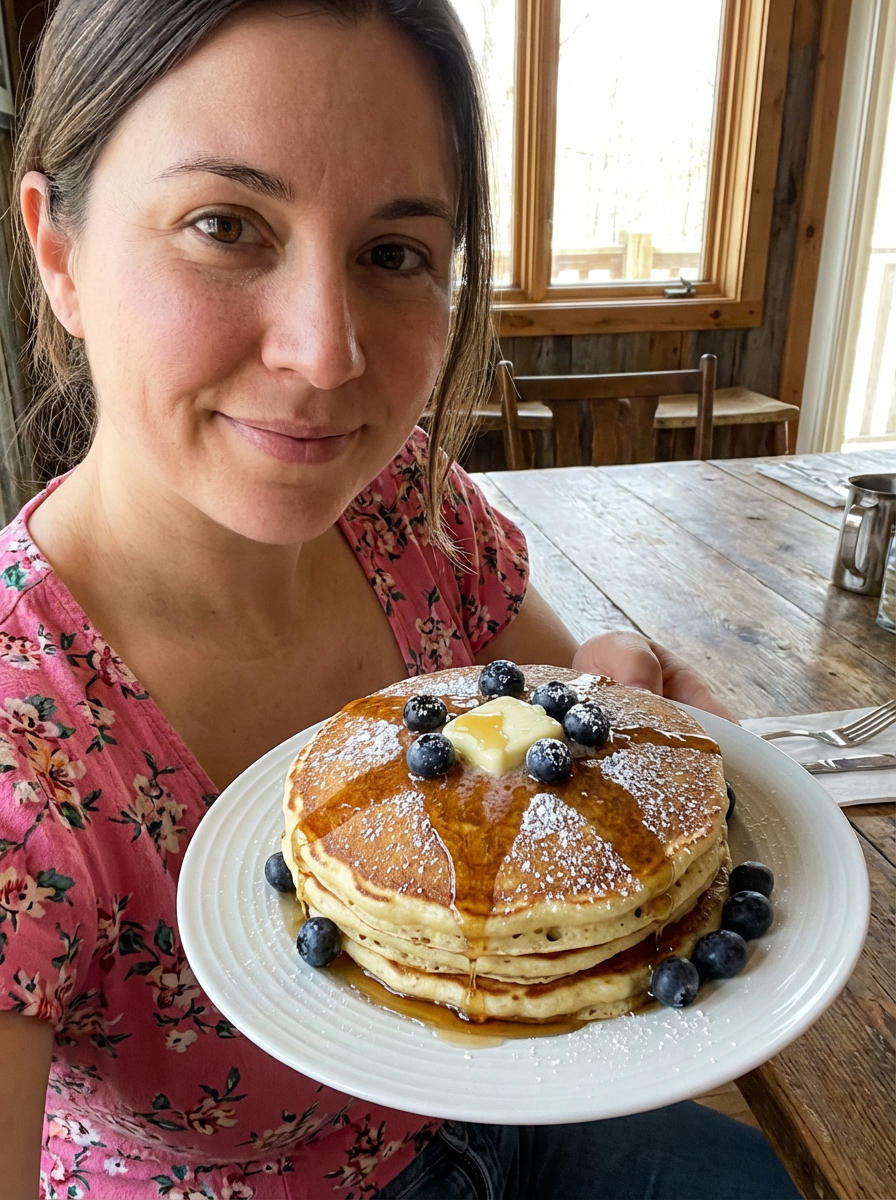 a close-up, ultra-realistic photograph perfect for a cookbook captures a stack of fluffy blueberry pancakes with maple syrup dripping down the sides, topped with fresh blueberries, a pat of butter, and a sprinkle of powdered sugar.