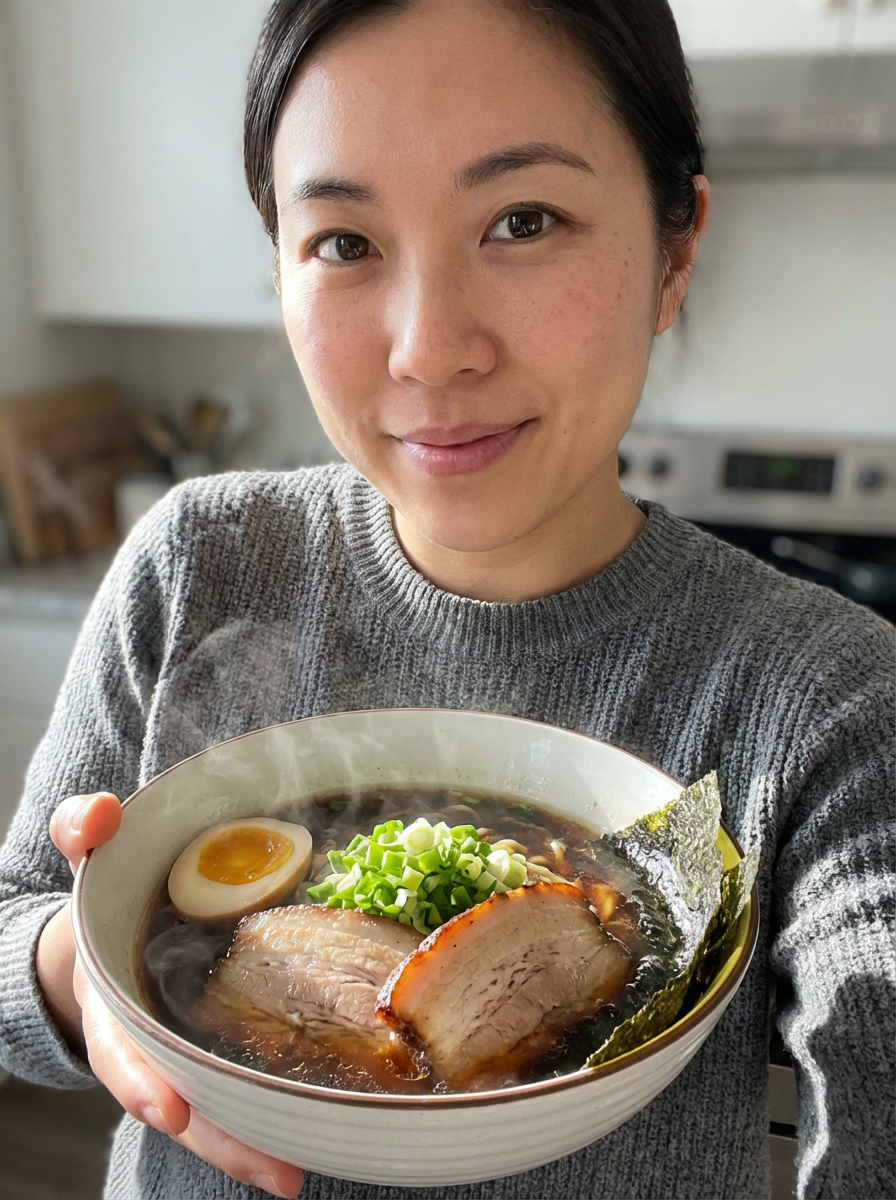 a close-up, ultra-realistic photograph perfect for a cookbook captures a steaming bowl of ramen with sliced pork belly, soft-boiled egg, green onions, and nori, in a rich umami broth with visible steam rising.