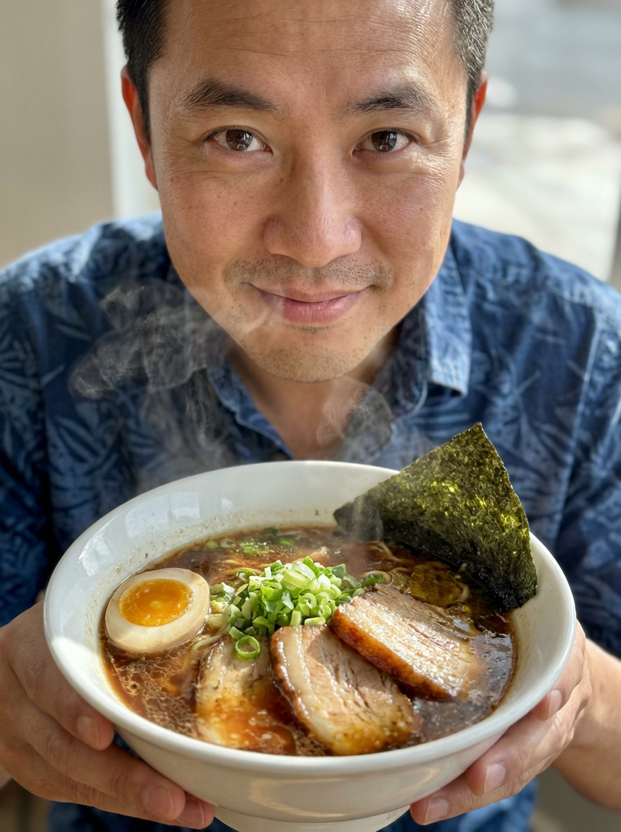 a close-up, ultra-realistic photograph perfect for a cookbook captures a steaming bowl of ramen with sliced pork belly, soft-boiled egg, green onions, and nori, in a rich umami broth with visible steam rising.