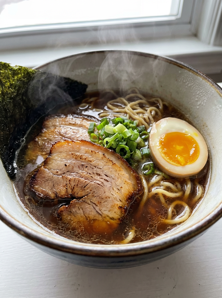 a close-up, ultra-realistic photograph perfect for a cookbook captures a steaming bowl of ramen with sliced pork belly, soft-boiled egg, green onions, and nori, in a rich umami broth with visible steam rising.