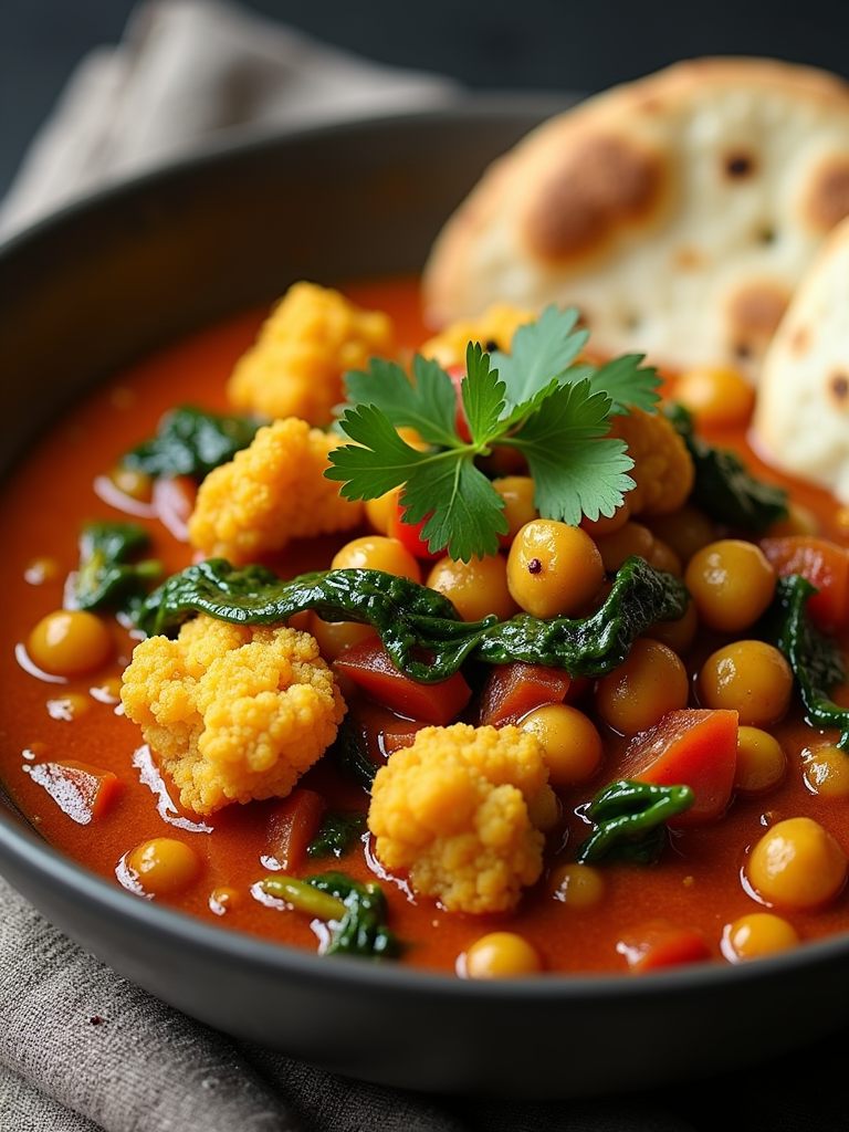 a close-up, ultra-realistic photograph perfect for a cookbook captures a vibrant vegetable curry with cauliflower, chickpeas, spinach, and tomatoes in a rich spiced sauce, garnished with cilantro and served with naan bread.