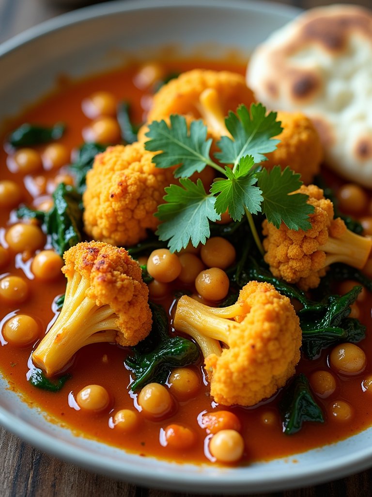 a close-up, ultra-realistic photograph perfect for a cookbook captures a vibrant vegetable curry with cauliflower, chickpeas, spinach, and tomatoes in a rich spiced sauce, garnished with cilantro and served with naan bread.