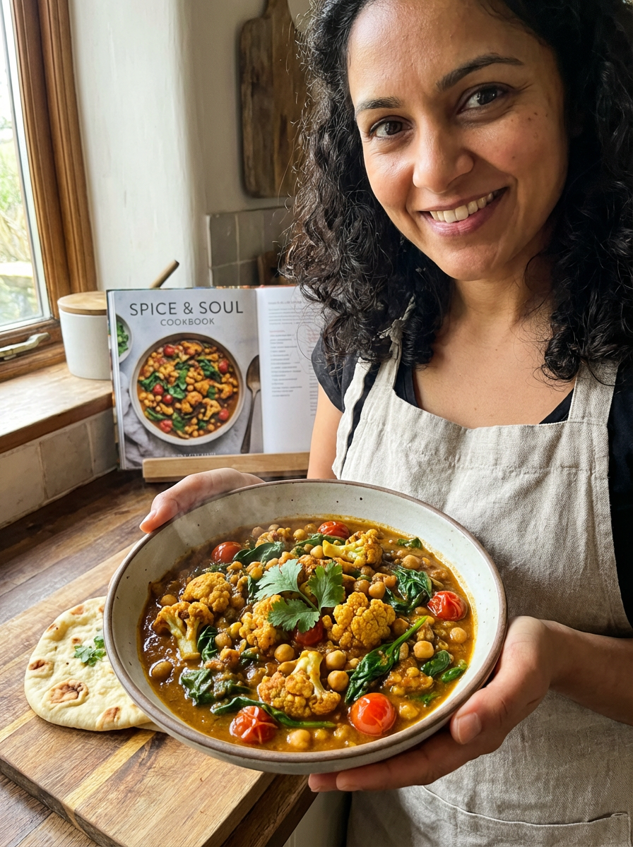 a close-up, ultra-realistic photograph perfect for a cookbook captures a vibrant vegetable curry with cauliflower, chickpeas, spinach, and tomatoes in a rich spiced sauce, garnished with cilantro and served with naan bread.