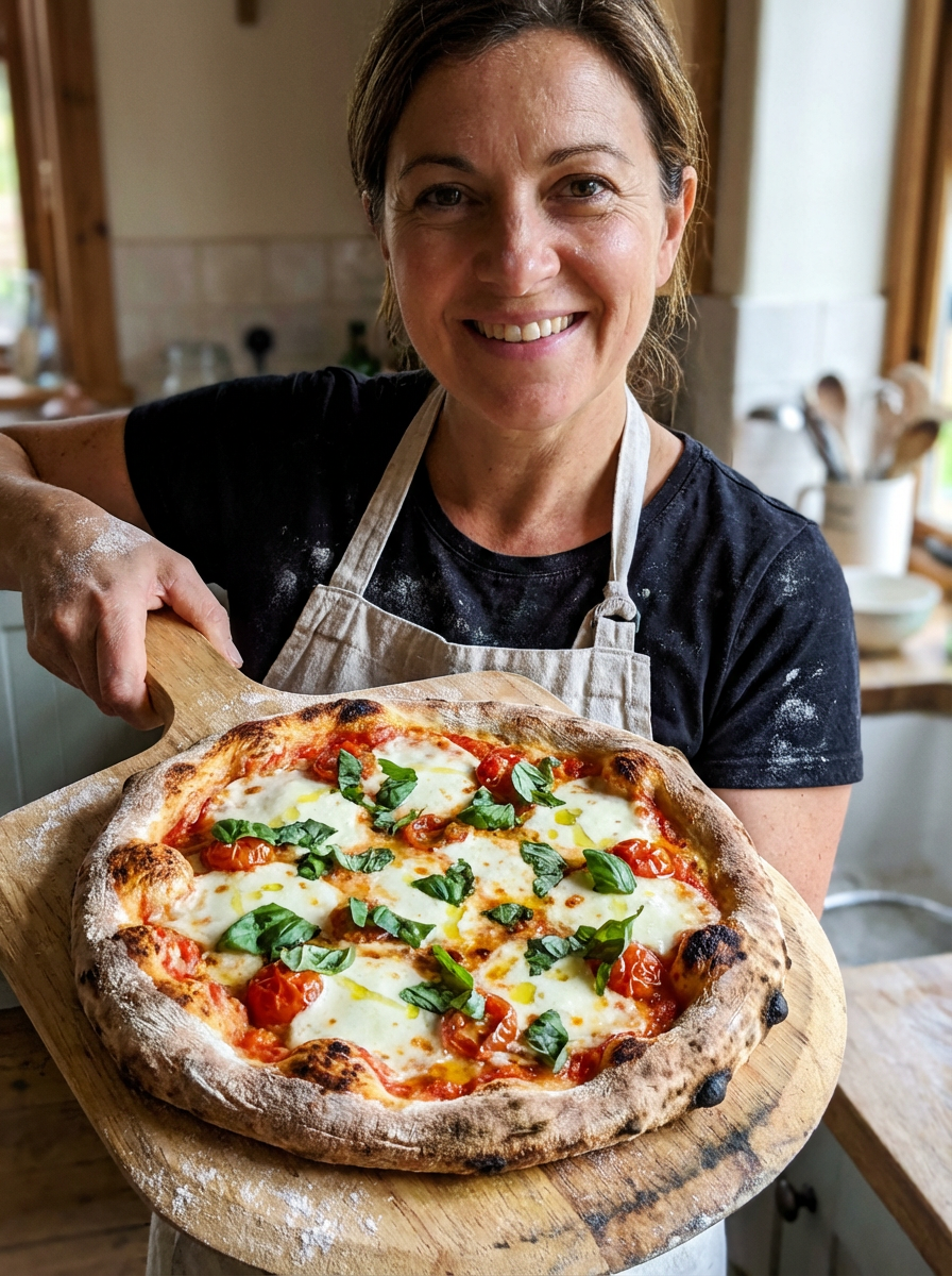 a close-up, ultra-realistic photograph perfect for a cookbook captures a vibrant homemade margherita pizza with bubbling mozzarella, fresh basil leaves, and bright red tomatoes on a perfectly charred crust, dusted with flour and drizzled with olive oil.