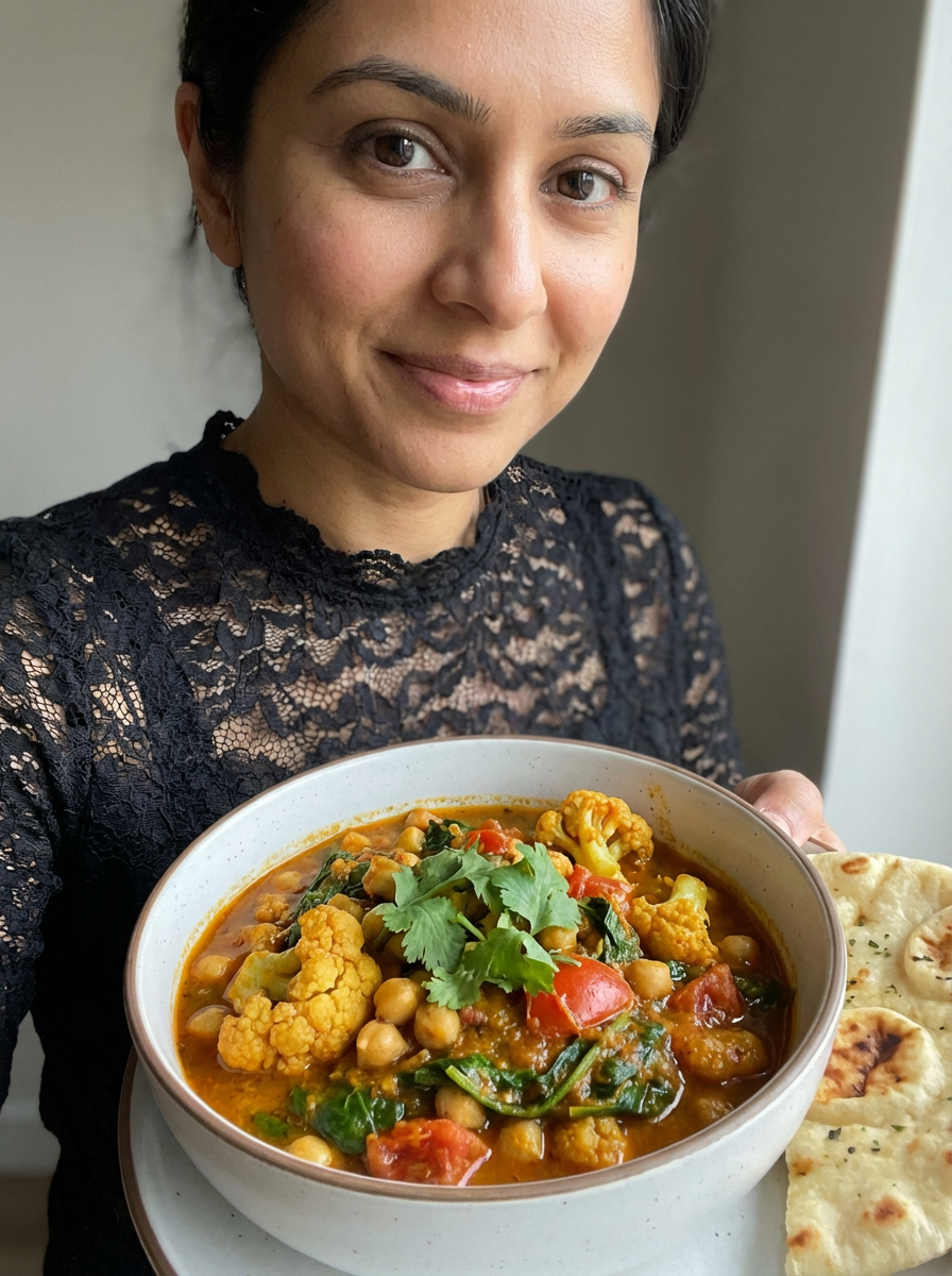 a close-up, ultra-realistic photograph perfect for a cookbook captures a vibrant vegetable curry with cauliflower, chickpeas, spinach, and tomatoes in a rich spiced sauce, garnished with cilantro and served with naan bread.