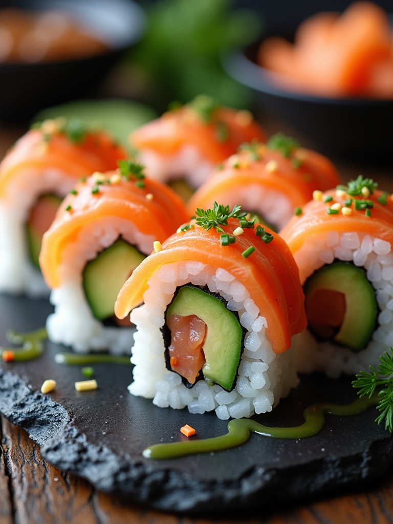 a close-up, ultra-realistic photograph perfect for a cookbook captures homemade sushi rolls with fresh salmon, avocado, and cucumber, served with pickled ginger, wasabi, and soy sauce on a slate plate.