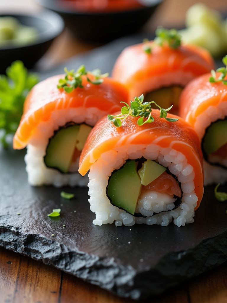a close-up, ultra-realistic photograph perfect for a cookbook captures homemade sushi rolls with fresh salmon, avocado, and cucumber, served with pickled ginger, wasabi, and soy sauce on a slate plate.