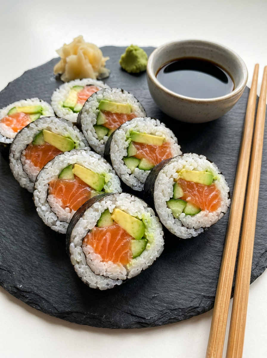 a close-up, ultra-realistic photograph perfect for a cookbook captures homemade sushi rolls with fresh salmon, avocado, and cucumber, served with pickled ginger, wasabi, and soy sauce on a slate plate.