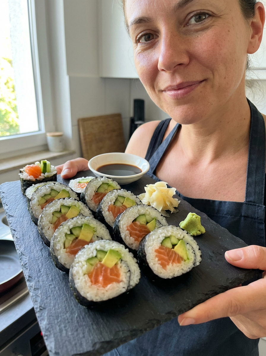 a close-up, ultra-realistic photograph perfect for a cookbook captures homemade sushi rolls with fresh salmon, avocado, and cucumber, served with pickled ginger, wasabi, and soy sauce on a slate plate.