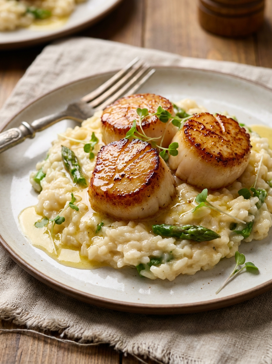 a close-up, ultra-realistic photograph perfect for a cookbook captures perfectly seared scallops with a golden crust, served on a bed of creamy risotto with asparagus tips and a lemon butter sauce, garnished with microgreens.