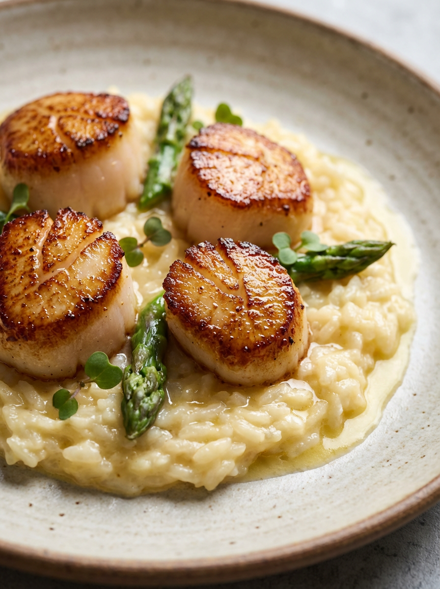 a close-up, ultra-realistic photograph perfect for a cookbook captures perfectly seared scallops with a golden crust, served on a bed of creamy risotto with asparagus tips and a lemon butter sauce, garnished with microgreens.