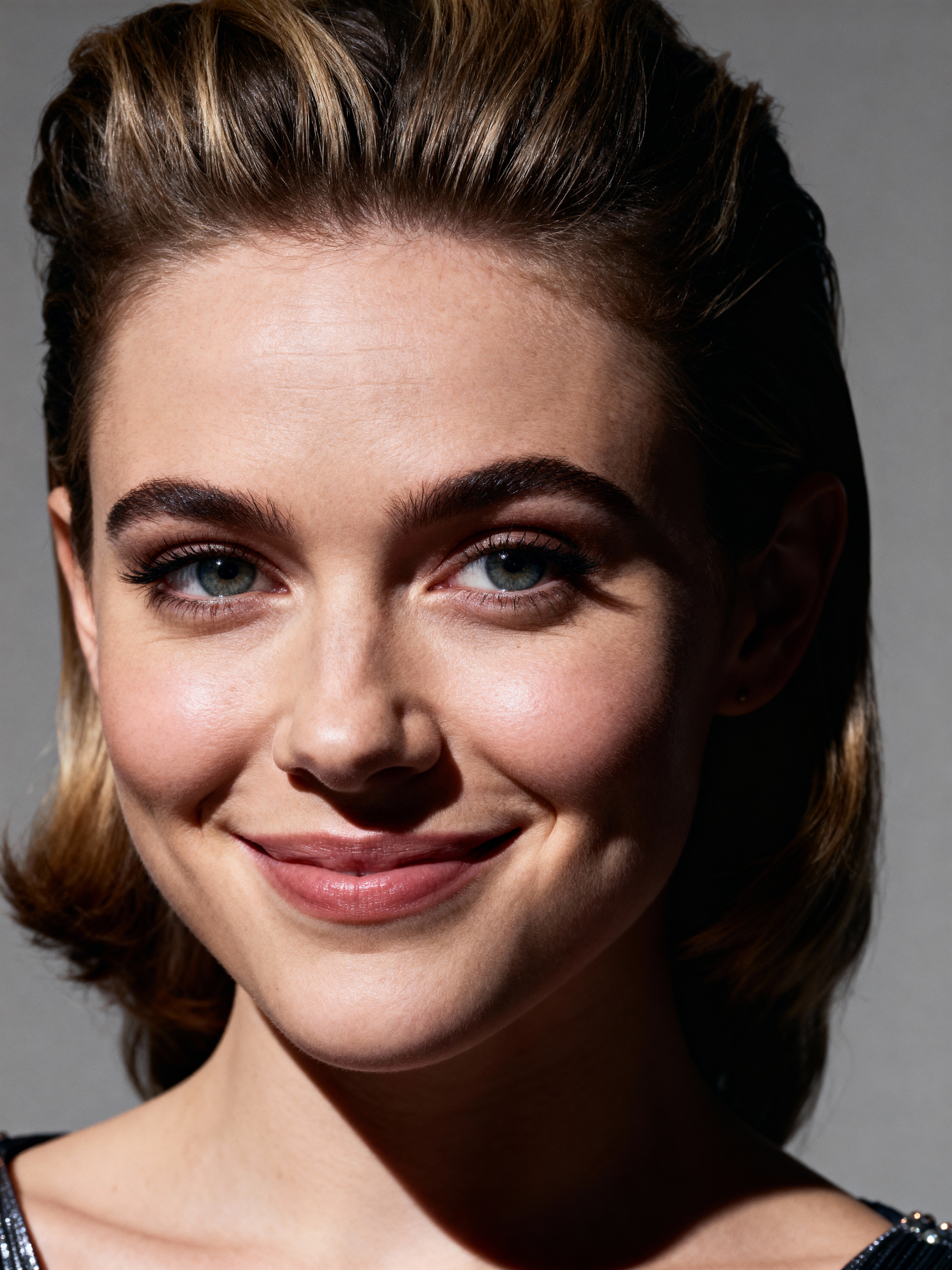 A comedian headshot featuring a subtle smirk and expressive eyes, taken in a well-lit professional studio. The model is dressed in a sleek top with a bit of personality, styled hair, and a confident gaze . The background is neutral, ensuring the subject stands out. The lighting highlights natural features, capturing an inviting and charismatic presence, perfect for comedy auditions, film roles, and industry portfolios.