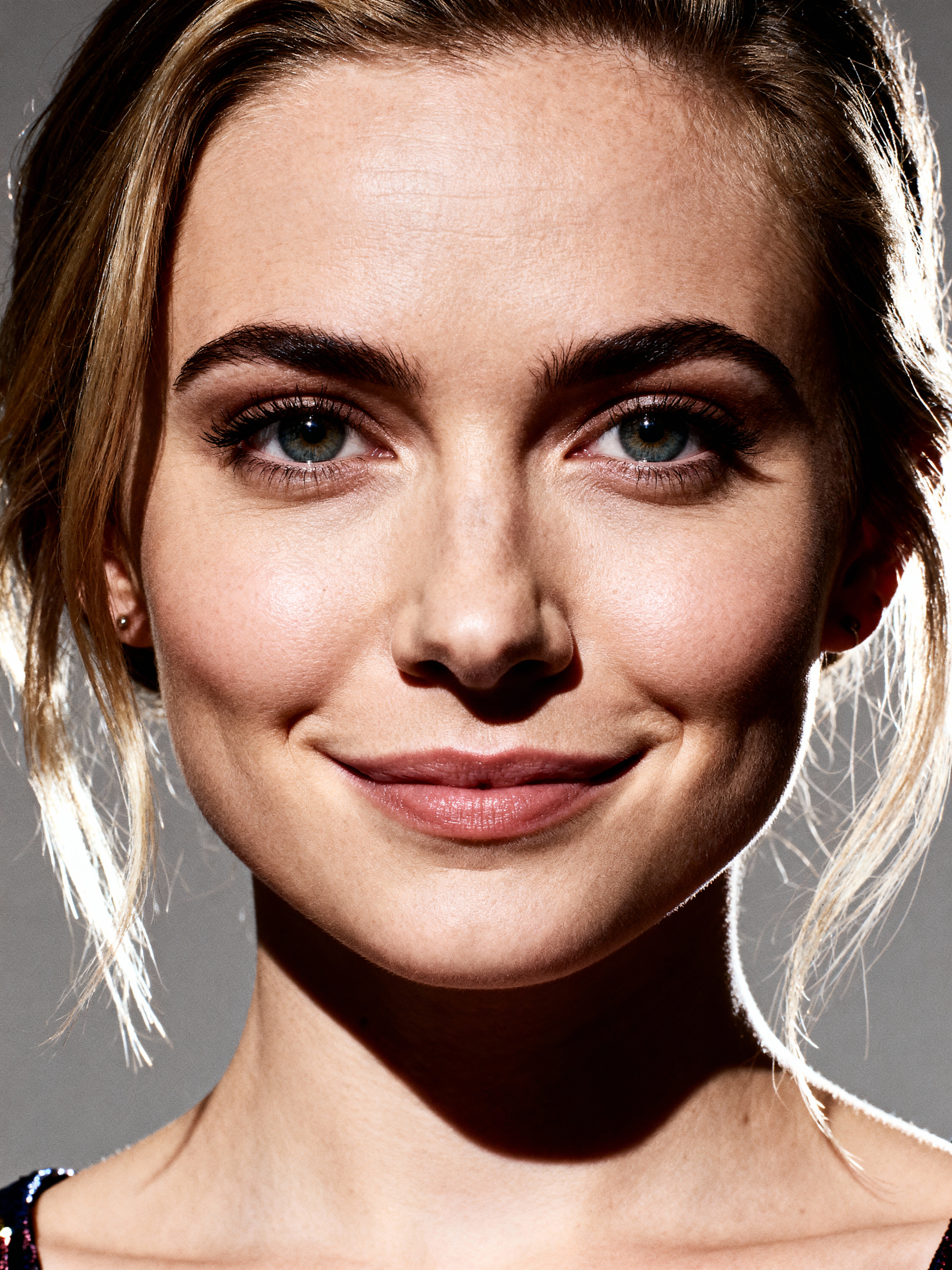 A comedian headshot featuring a subtle smirk and expressive eyes, taken in a well-lit professional studio. The model is dressed in a sleek top with a bit of personality, styled hair, and a confident gaze . The background is neutral, ensuring the subject stands out. The lighting highlights natural features, capturing an inviting and charismatic presence, perfect for comedy auditions, film roles, and industry portfolios.