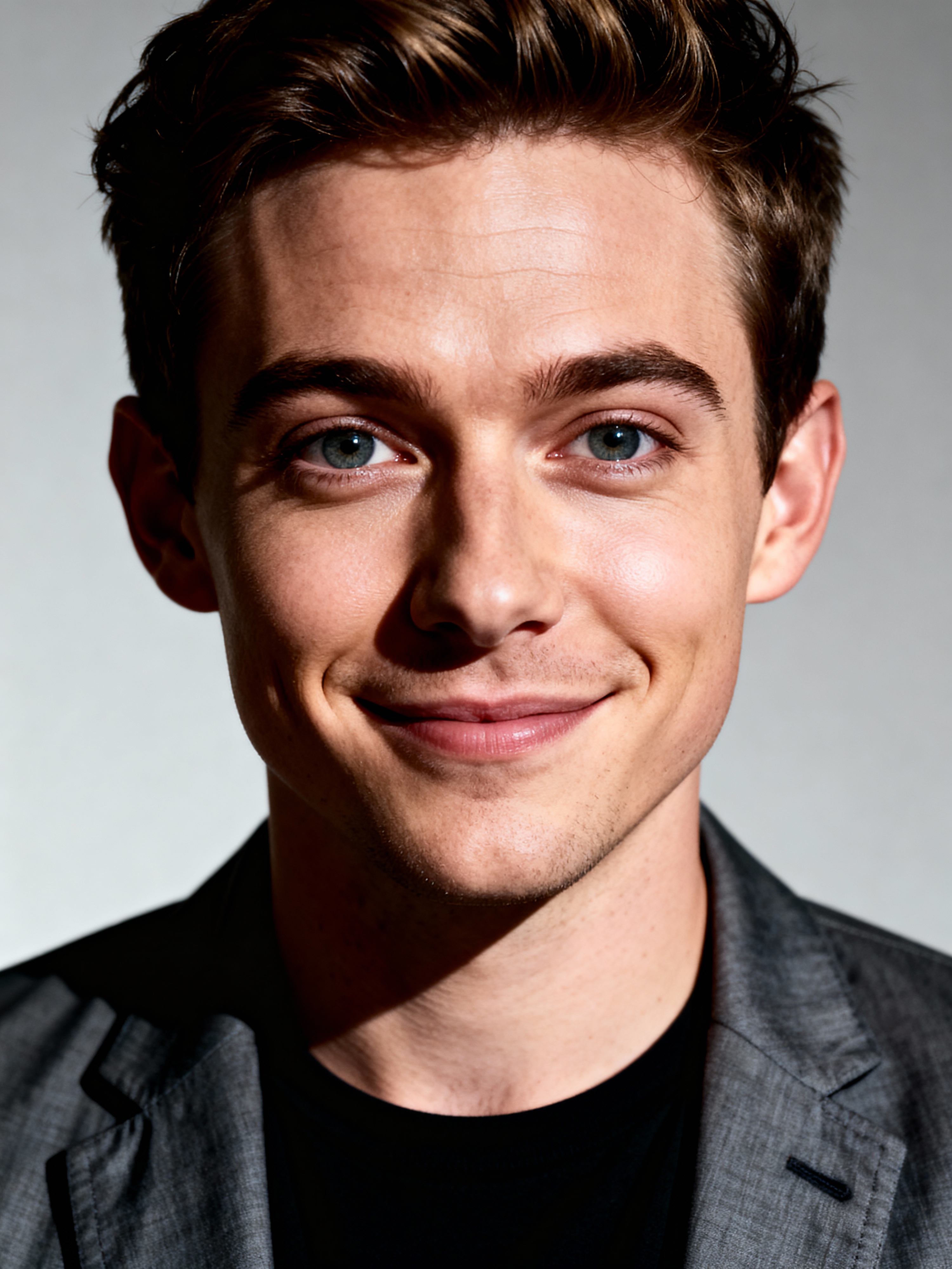 A comedian headshot featuring a subtle smirk and expressive eyes, taken in a well-lit professional studio. The model is dressed in a modern fitted casual jacket or blazer, styled effortlessly for a relatable yet polished look. The background is neutral, ensuring the subject stands out. The lighting highlights natural features, capturing an inviting and charismatic presence, perfect for comedy auditions, film roles, and industry portfolios.