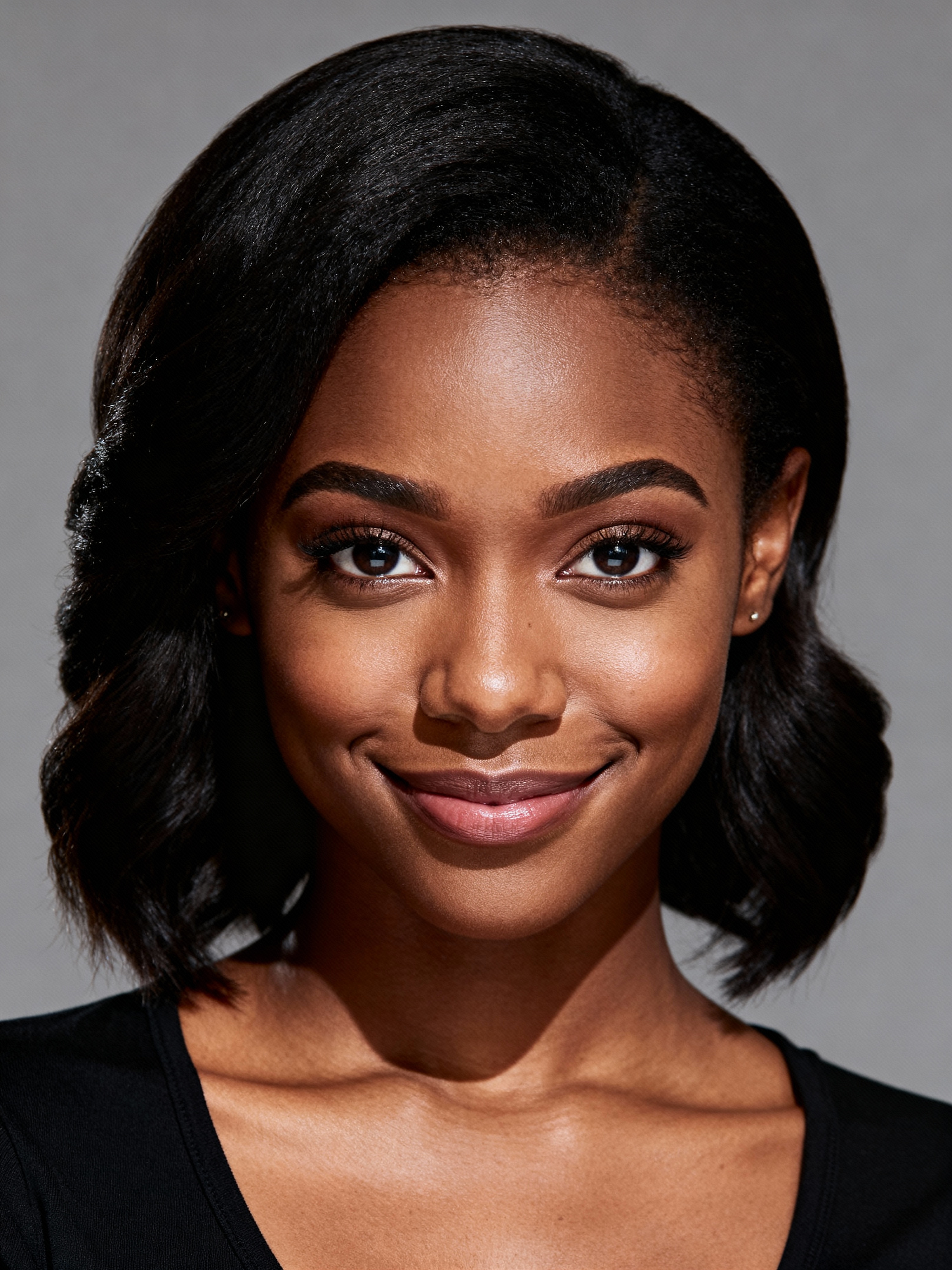 A comedian headshot featuring a subtle smirk and expressive eyes, taken in a well-lit professional studio. The model is dressed in a sleek top with a bit of personality, styled hair, and a confident gaze . The background is neutral, ensuring the subject stands out. The lighting highlights natural features, capturing an inviting and charismatic presence, perfect for comedy auditions, film roles, and industry portfolios.