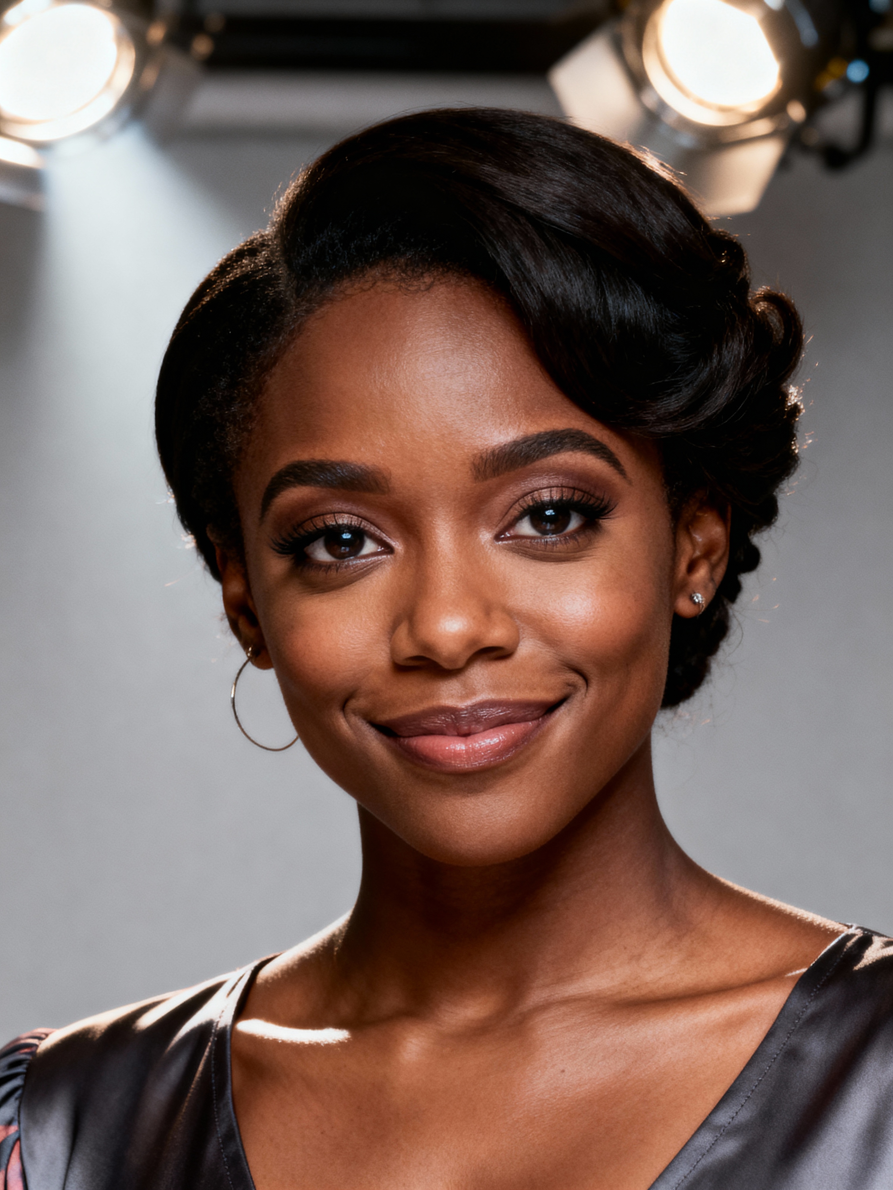 A comedian headshot featuring a subtle smirk and expressive eyes, taken in a well-lit professional studio. The model is dressed in a sleek top with a bit of personality, styled hair, and a confident gaze . The background is neutral, ensuring the subject stands out. The lighting highlights natural features, capturing an inviting and charismatic presence, perfect for comedy auditions, film roles, and industry portfolios.