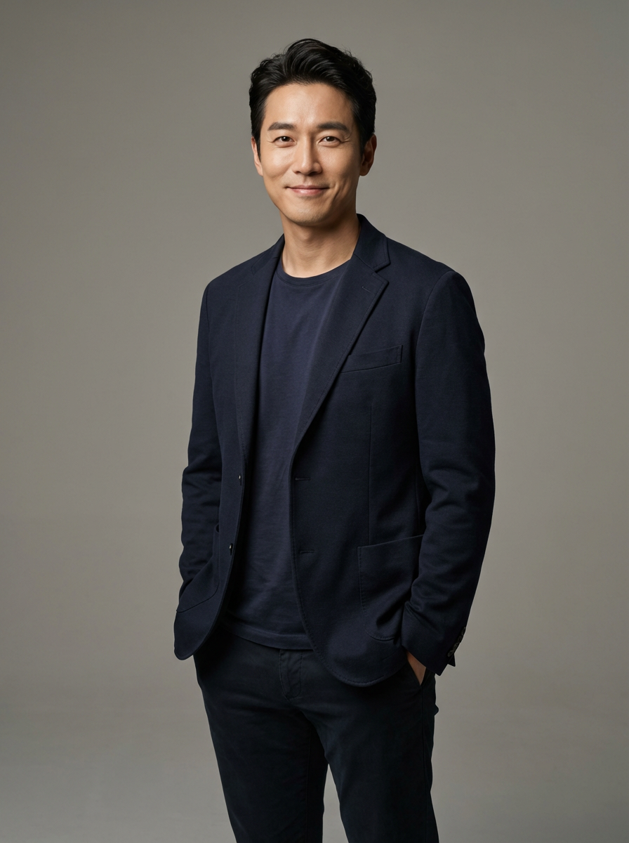 A comedian headshot featuring a subtle smirk and expressive eyes, taken in a well-lit professional studio. The model is dressed in a modern fitted casual jacket or blazer, styled effortlessly for a relatable yet polished look. The background is neutral, ensuring the subject stands out. The lighting highlights natural features, capturing an inviting and charismatic presence, perfect for comedy auditions, film roles, and industry portfolios.