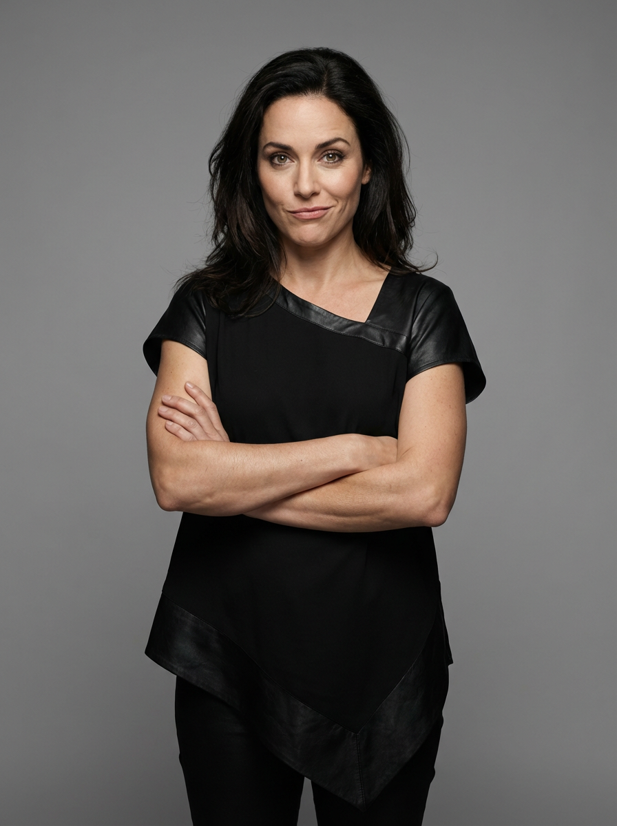 A comedian headshot featuring a subtle smirk and expressive eyes, taken in a well-lit professional studio. The model is dressed in a sleek top with a bit of personality, styled hair, and a confident gaze . The background is neutral, ensuring the subject stands out. The lighting highlights natural features, capturing an inviting and charismatic presence, perfect for comedy auditions, film roles, and industry portfolios.