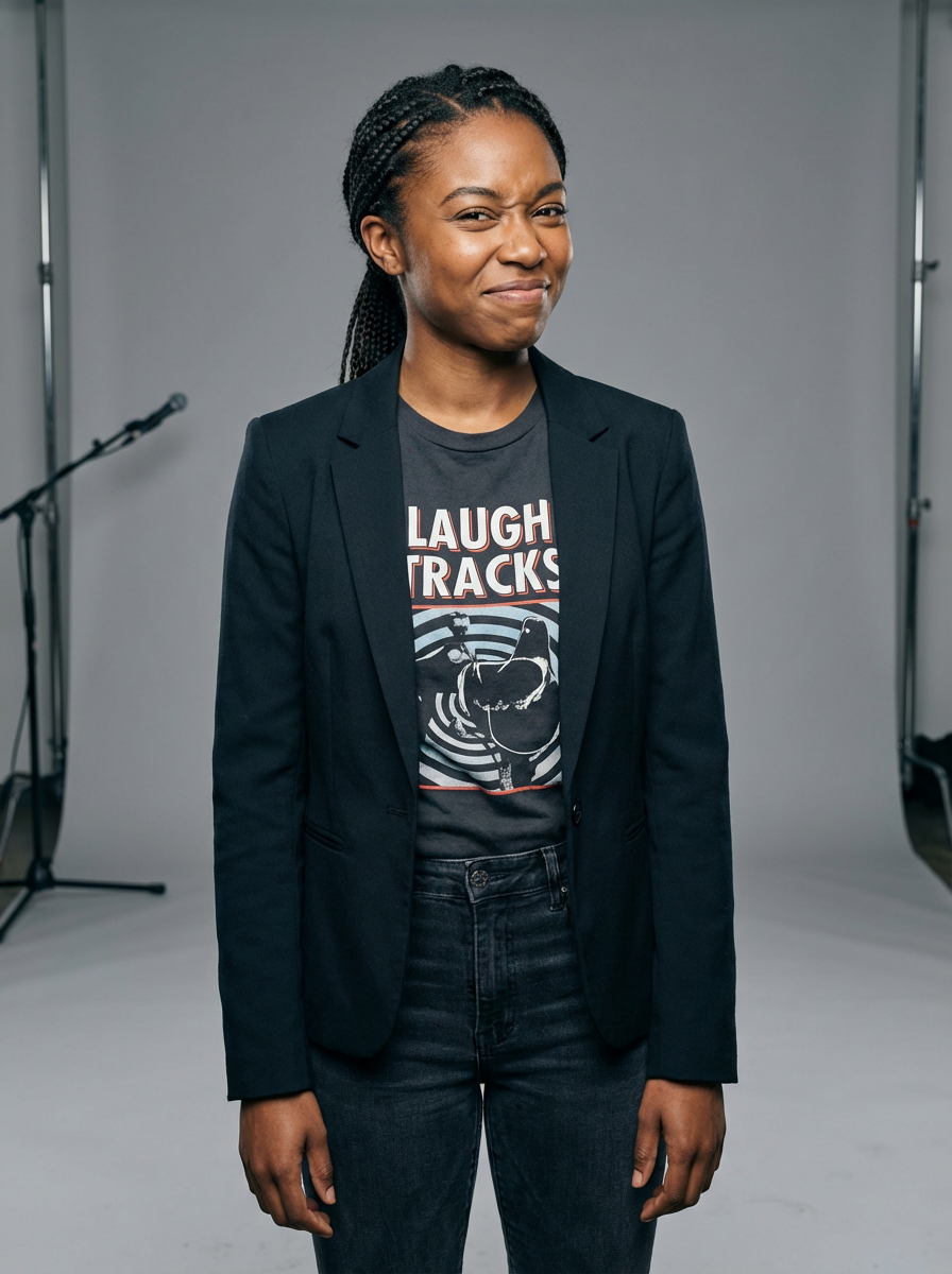 A comedian headshot featuring a subtle smirk and expressive eyes, taken in a well-lit professional studio. The model is dressed in a sleek top with a bit of personality, styled hair, and a confident gaze . The background is neutral, ensuring the subject stands out. The lighting highlights natural features, capturing an inviting and charismatic presence, perfect for comedy auditions, film roles, and industry portfolios.