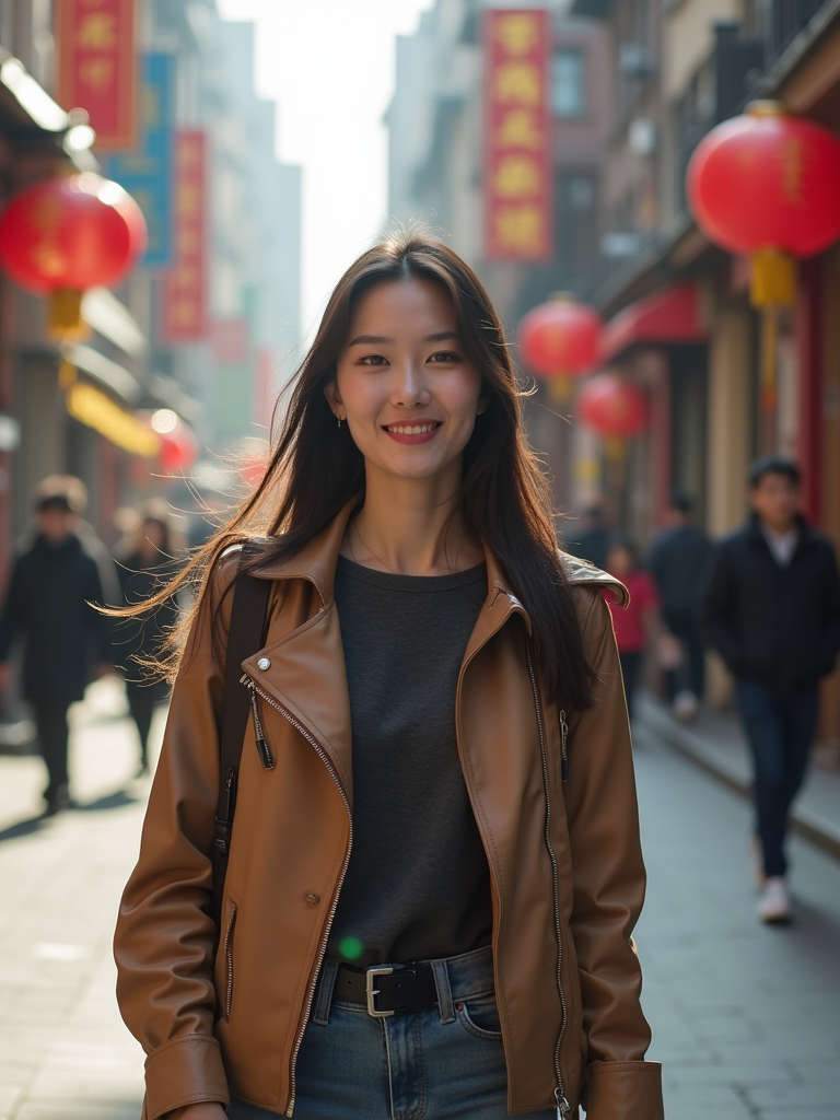 a confident feminine model exploring a bustling city street