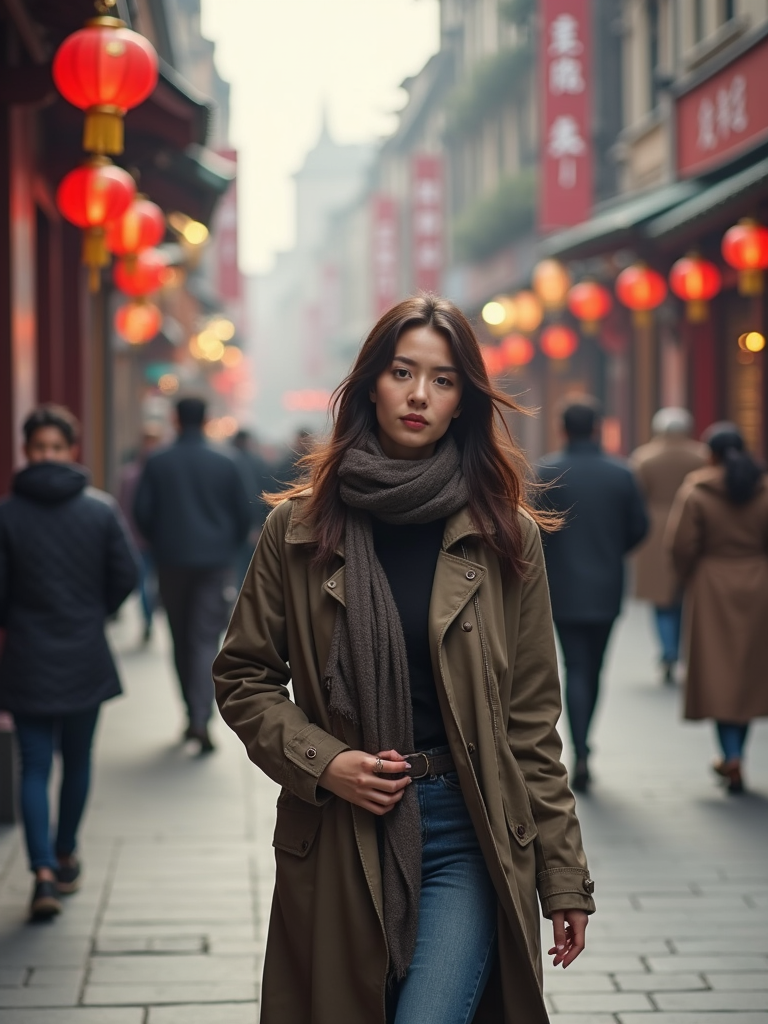 a confident feminine model exploring a bustling city street