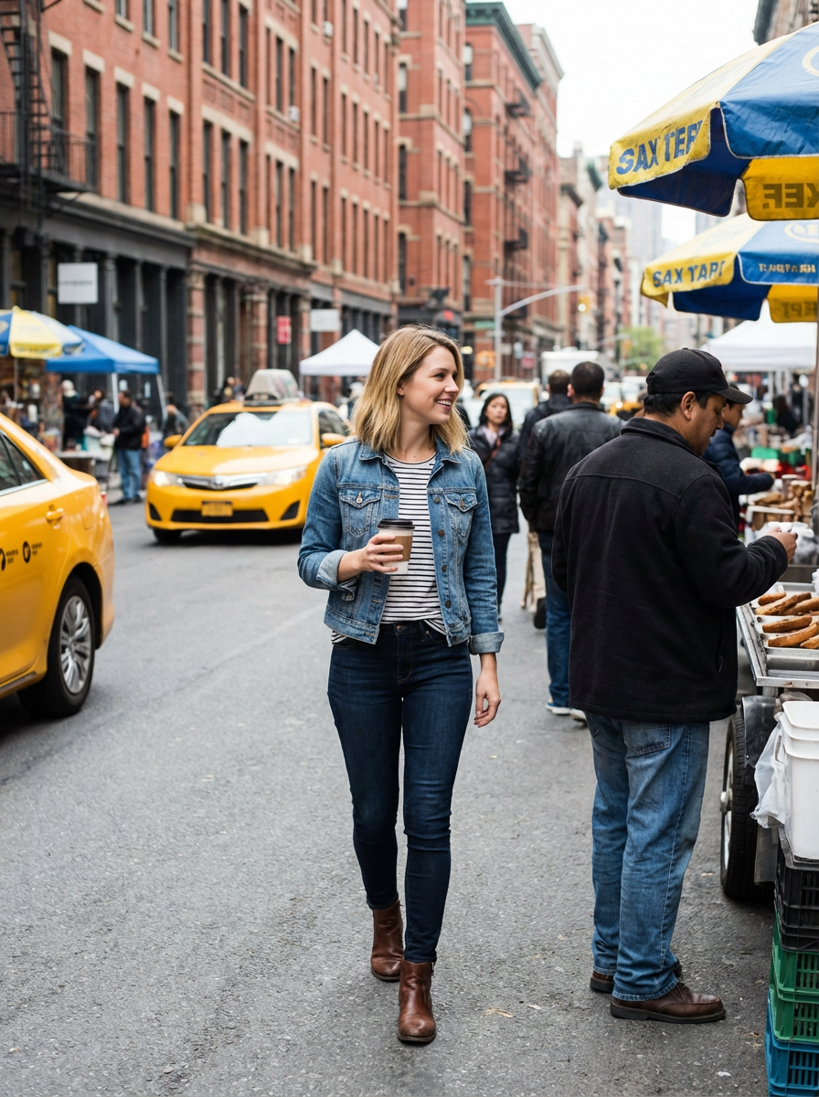 a confident feminine model exploring a bustling city street