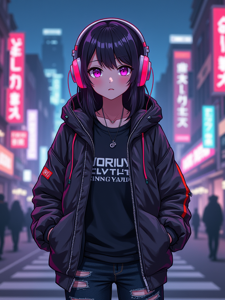 A cool anime streetwear avatar, wearing a sleek anime jacket with ripped jeans and futuristic headphones. The background is a neon-lit anime city at night.