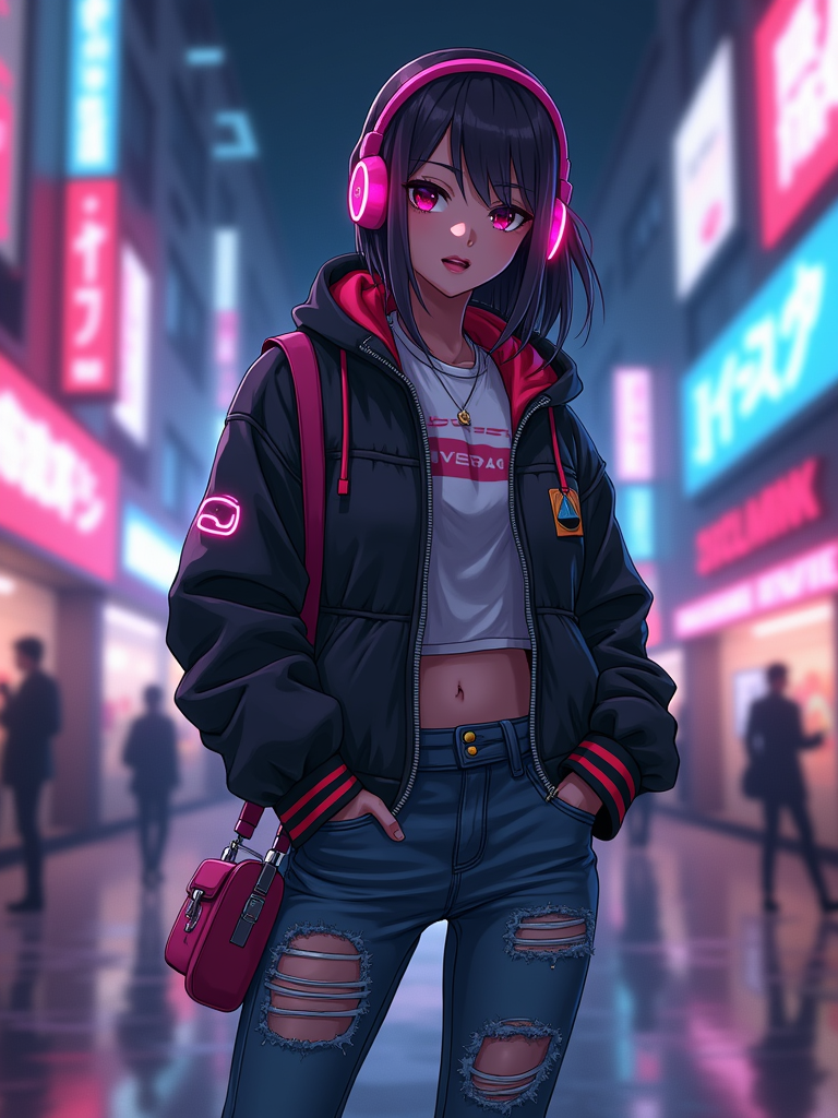 A cool anime streetwear avatar, wearing a sleek anime jacket with ripped jeans and futuristic headphones. The background is a neon-lit anime city at night.
