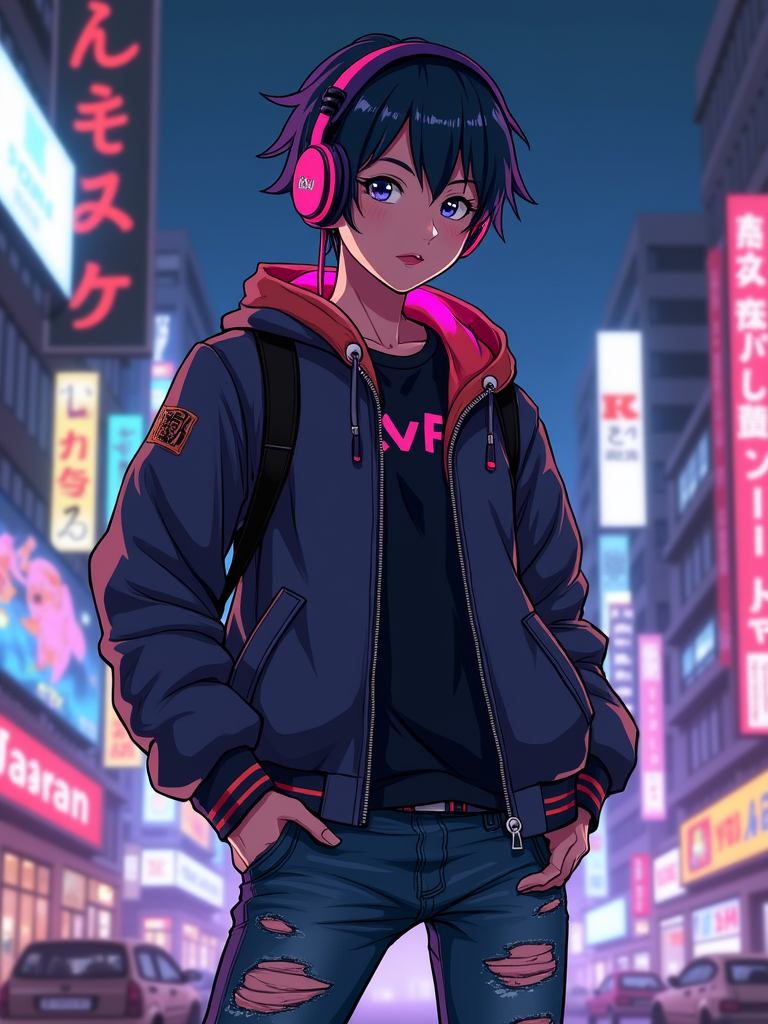 A cool anime streetwear avatar, wearing a sleek anime jacket with ripped jeans and futuristic headphones. The background is a neon-lit anime city at night. the style is in anime illustration.