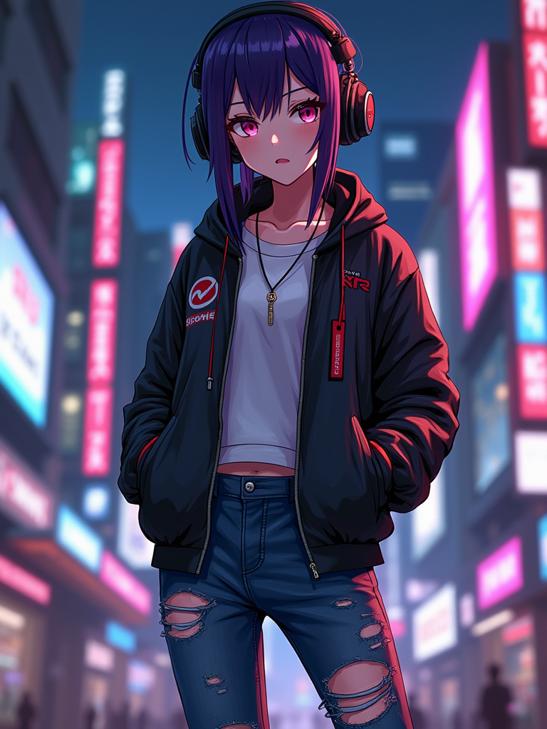 A cool anime streetwear avatar, wearing a sleek anime jacket with ripped jeans and futuristic headphones. The background is a neon-lit anime city at night. the style is in anime illustration.