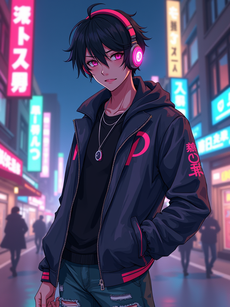 A cool anime streetwear avatar, wearing a sleek anime jacket with ripped jeans and futuristic headphones. The background is a neon-lit anime city at night. the style is in anime illustration.