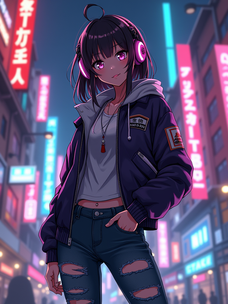 A cool anime streetwear avatar, wearing a sleek anime jacket with ripped jeans and futuristic headphones. The background is a neon-lit anime city at night. the style is in anime illustration.