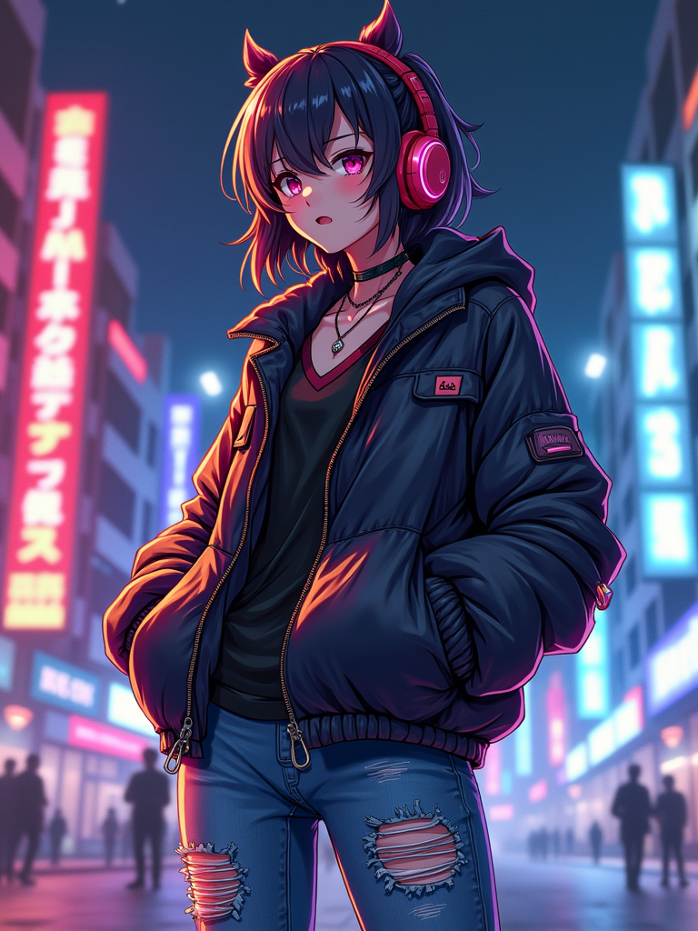 A cool anime streetwear avatar, wearing a sleek anime jacket with ripped jeans and futuristic headphones. The background is a neon-lit anime city at night. the style is in anime illustration.