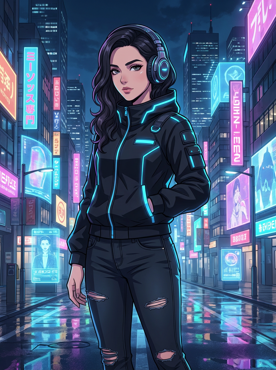A cool anime streetwear avatar, wearing a sleek anime jacket with ripped jeans and futuristic headphones. The background is a neon-lit anime city at night. the style is in anime illustration.