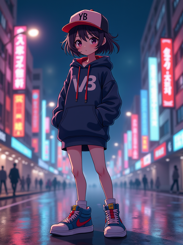 A cool anime streetwear avatar, wearing a trendy oversized hoodie with stylish sneakers and a cute cap . The background is a neon-lit anime city at night. the style is in anime illustration.