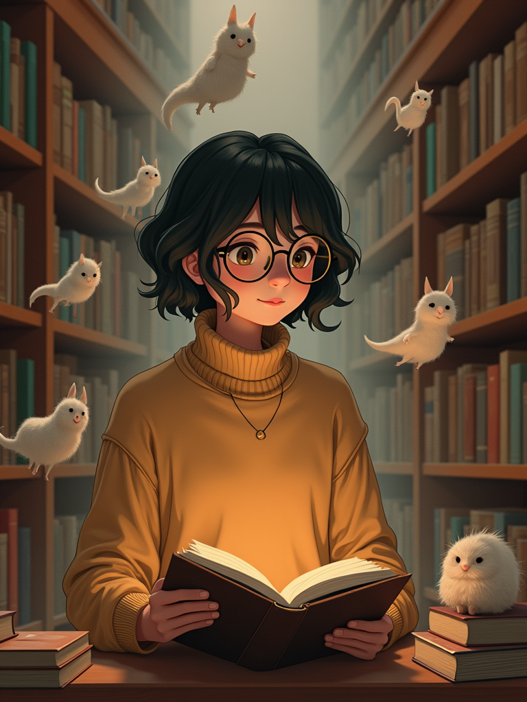 A cozy line art anime-inspired portrait in a magical library, the character wearing a comfortable sweater and reading glasses, surrounded by floating books and dust spirits. The library has endless shelves and warm lighting. The style is warm like a line art anime film.