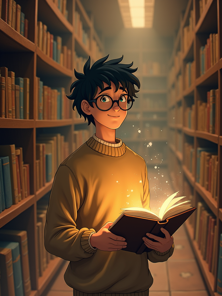A cozy line art anime-inspired portrait in a magical library, the character wearing a comfortable sweater and reading glasses, surrounded by floating books and dust spirits. The library has endless shelves and warm lighting. The style is warm like a line art anime film.