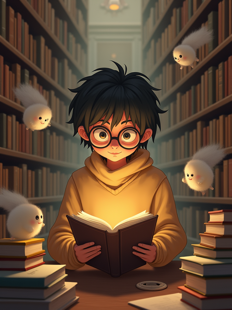 A cozy line art anime-inspired portrait in a magical library, the character wearing a comfortable sweater and reading glasses, surrounded by floating books and dust spirits. The library has endless shelves and warm lighting. The style is warm like a line art anime film.