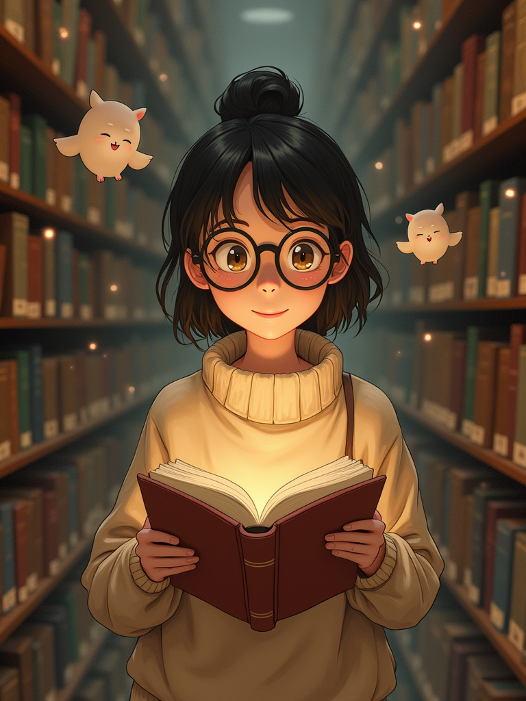 A cozy line art anime-inspired portrait in a magical library, the character wearing a comfortable sweater and reading glasses, surrounded by floating books and dust spirits. The library has endless shelves and warm lighting. The style is warm like a line art anime film.